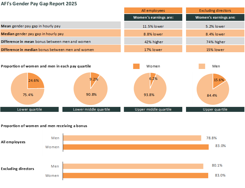 AFI’s median pay gap saw an even more marked reduction from 15.8% in 2024 to 8.8% in 2025 (8.4% when directors are excluded). These are the lowest levels of reported gap since gender pay gap reporting commenced in 2017 (excluding the 2020 and 2021 gender pay gap reports where data was heavily distorted by the impact of the COVID pandemic on working patterns).